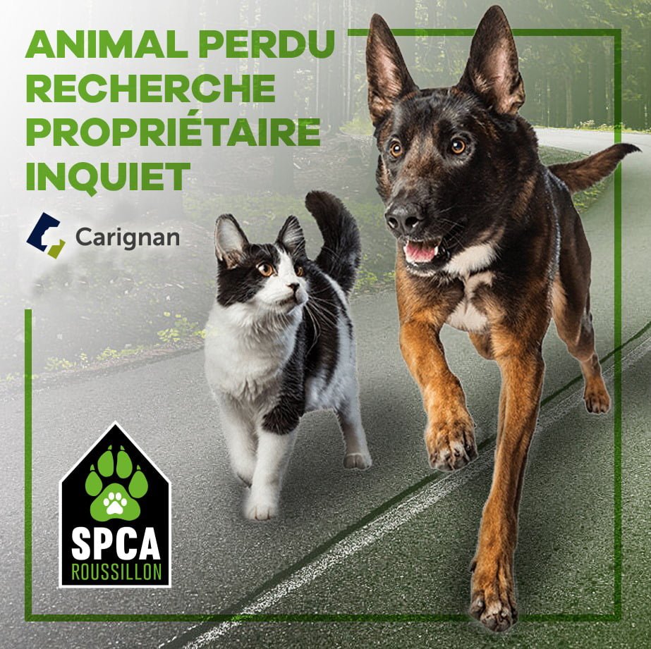 Pour signaler un animal perdu à Carignan, contactez la SPCA Roussillon et envoyez une photo de votre animal par courriel à info@spcaroussillon.com