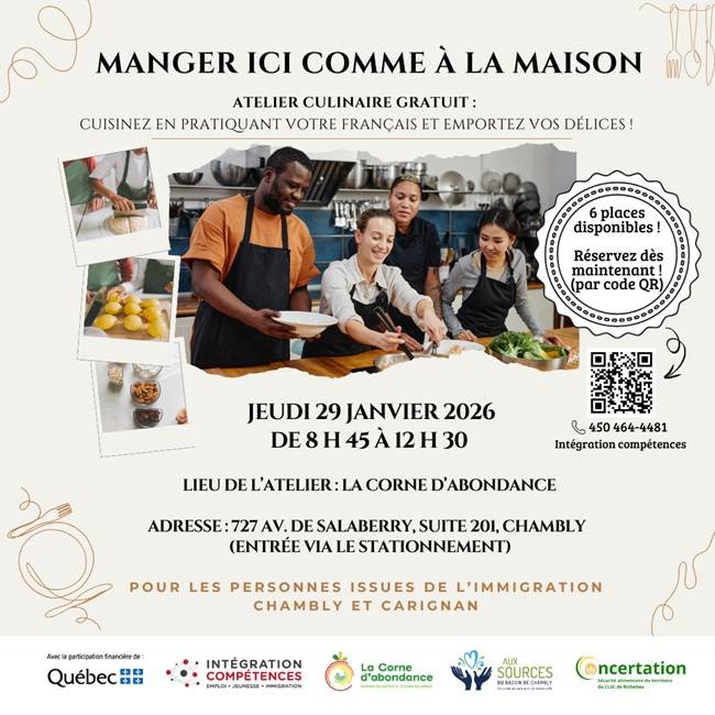 Les personnes issues de l’immigration qui résident les villes de Chambly et Carignan sont invitées à participer à un atelier culinaire gratuit sous le thème « Manger ici comme à la maison ».