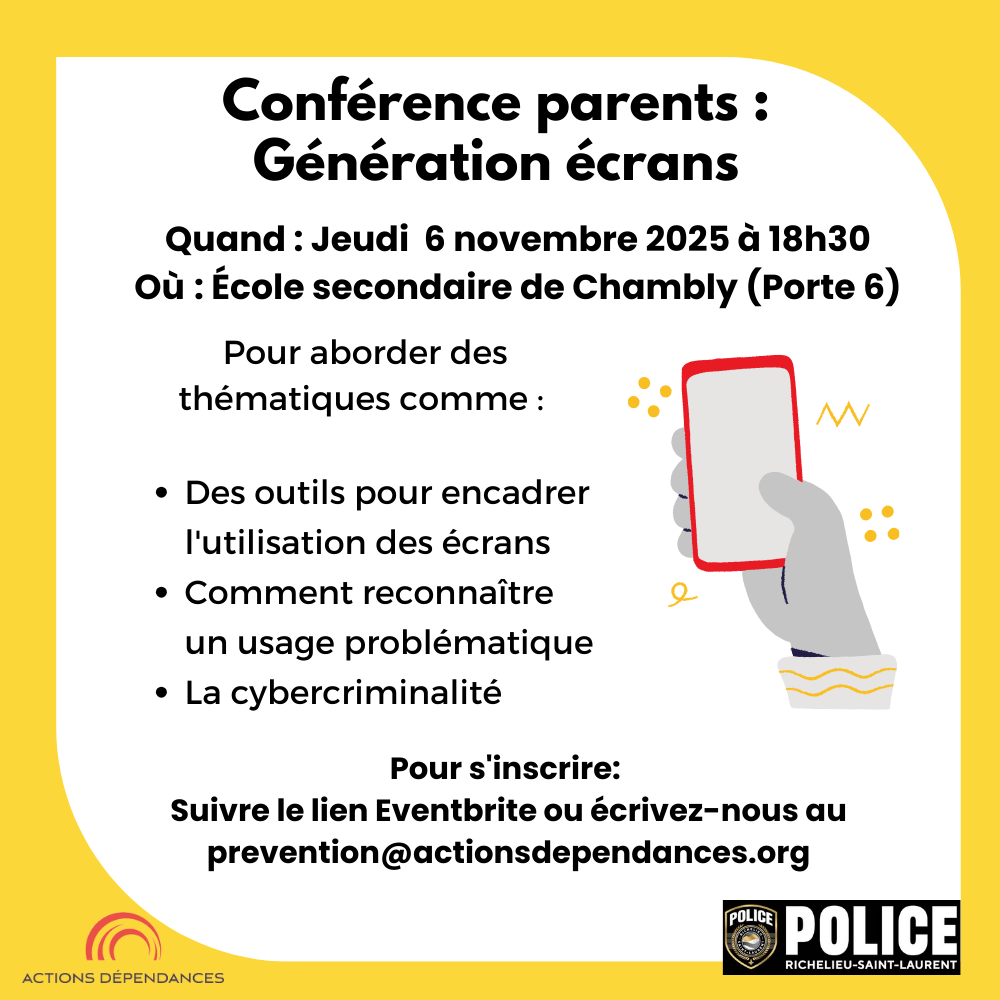 La Ville de Carignan partage cette invitation à l’intention des parents intéressés par la conférence Génération Écrans, présentée en collaboration avec la Régie intermunicipale de police Richelieu-Saint-Laurent et Actions Dépendances, un organisme œuvrant en prévention des dépendances.