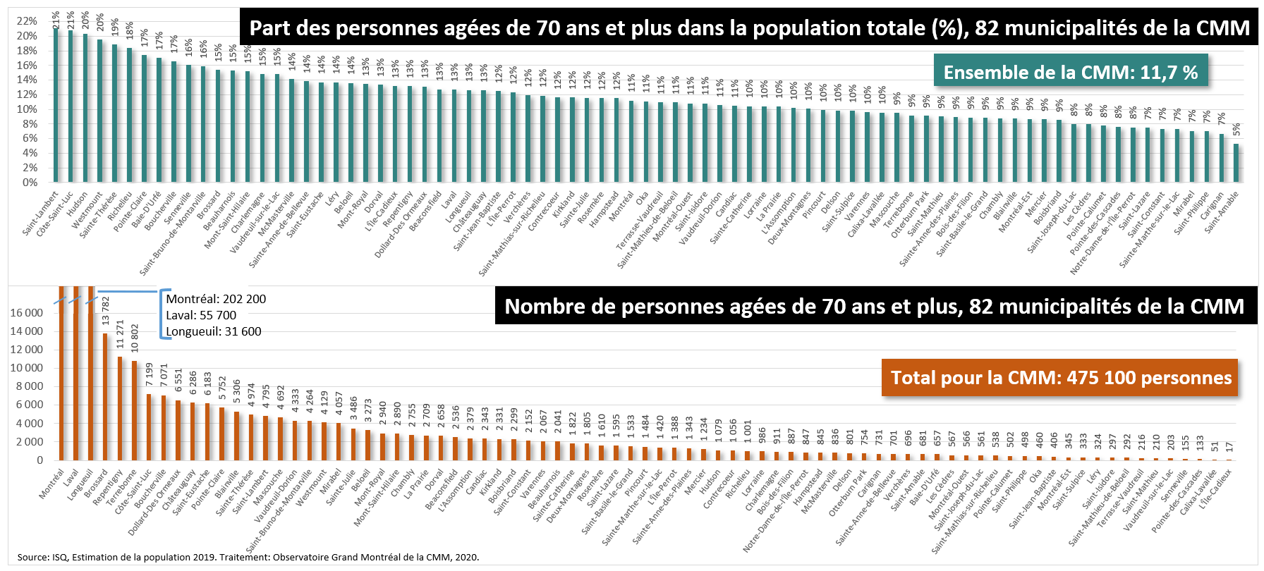 La Communauté métropolitaine de Montéal compte 475 000 personnes âgées de 70 ans et plus; cette population représentent 12 % de la population totale de la région. Ces personnes sont les plus à risque de décéder des complications de la COVID-19.