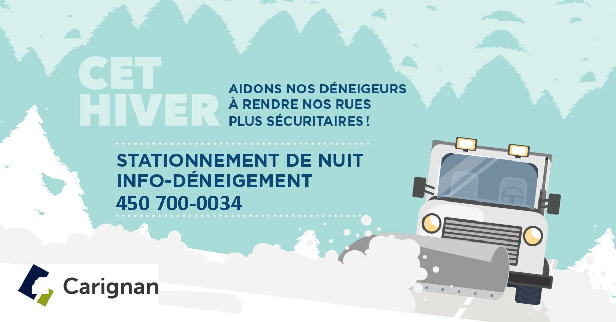 Pour une troisième année, la Ville de Carignan permettra le stationnement dans les rues de la municipalité du 1er décembre au 31 mars, sauf entre 2 h et 7 h du matin lorsqu'une opération de déneigement est en vigueur ou lorsqu'il y a présence de signalisation temporaire interdisant le stationnement pour permettre une opération de déneigement ponctuelle, comme le soufflement de la neige.