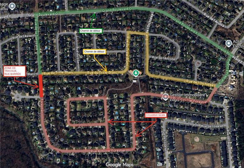 Durant cette période, la rue sera complètement fermée entre la rue du Trille-Blanc et la Place Antoine-Forestier, et l’accès au secteur se fera uniquement par l’autre extrémité de la rue Antoine-Forestier. Puisqu’un seul accès demeurera disponible, nous vous invitons à prévoir vos déplacements et à faire preuve de courtoisie.