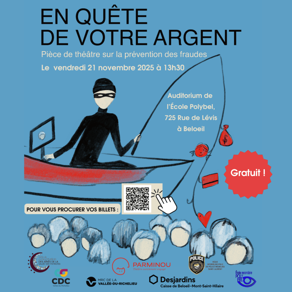 Dans le cadre de la démarche Municipalité amie des aînés (MADA), la MRC de La Vallée-du-Richelieu (MRCVR), en collaboration avec la Table de concertation des aînés de la Vallée-des-Patriotes et la Régie intermunicipale de police Richelieu–Saint-Laurent, présente la pièce En quête de votre argent du Théâtre Parminou.