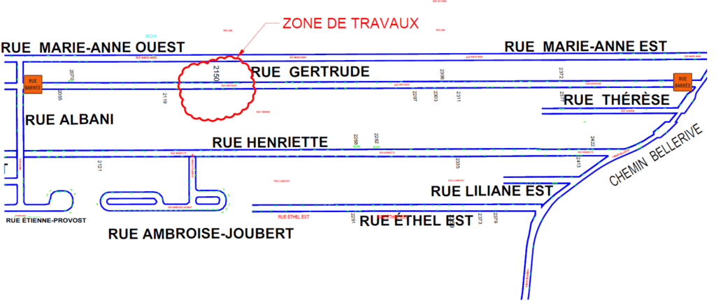 Des travaux de raccordement auront lieu environ le mardi 9 septembre 2025, plus précisément devant l’adresse civique 2150, rue Gertrude. Conséquemment, la rue sera fermée avec une circulation locale seulement durant les travaux.