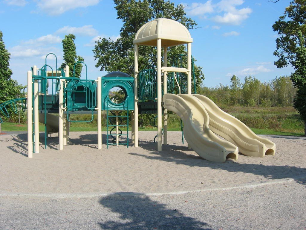 Parc écologique avec sentier pédestre donnant accès à l’étang gelé en hiver. Module de jeux et balançoires.