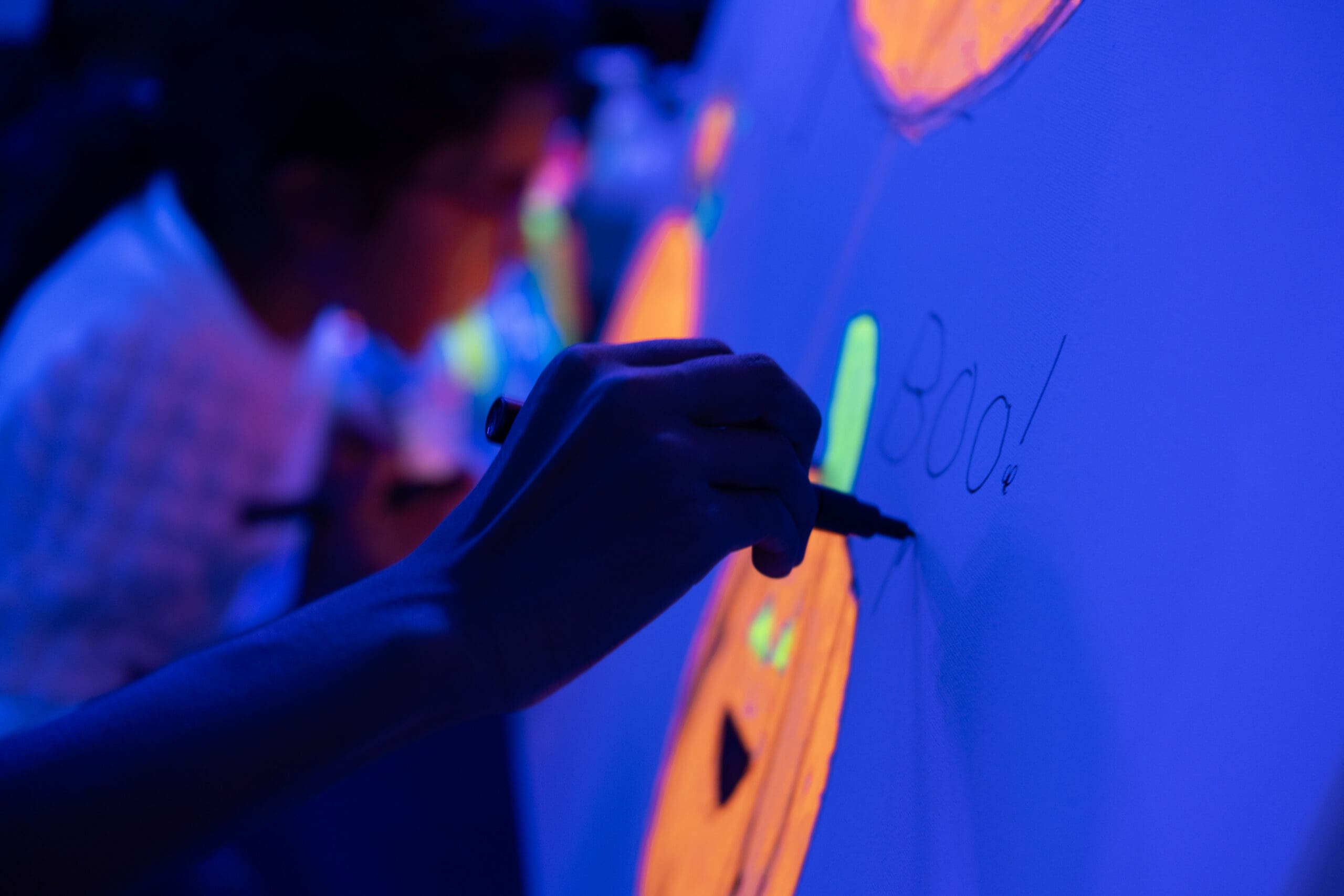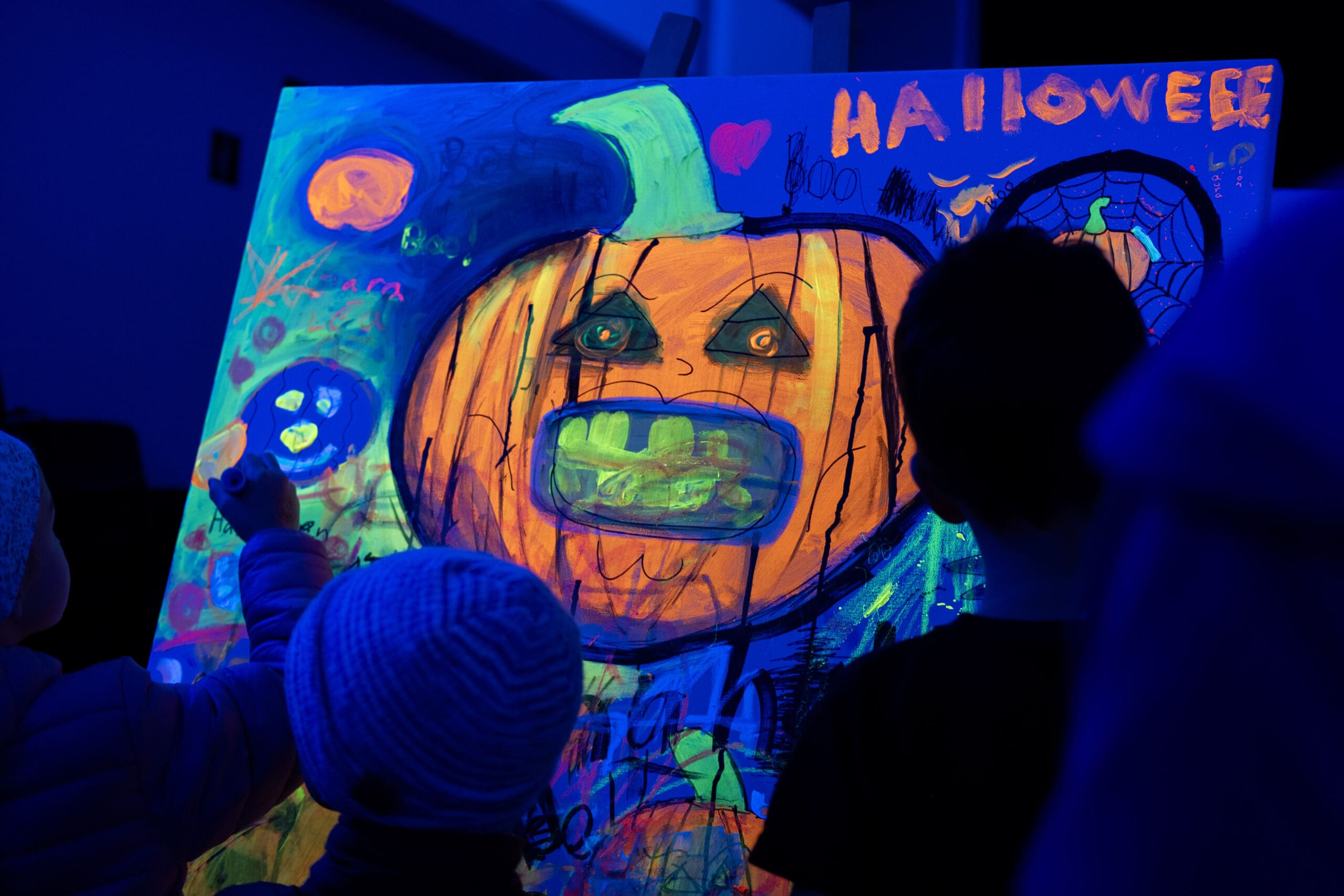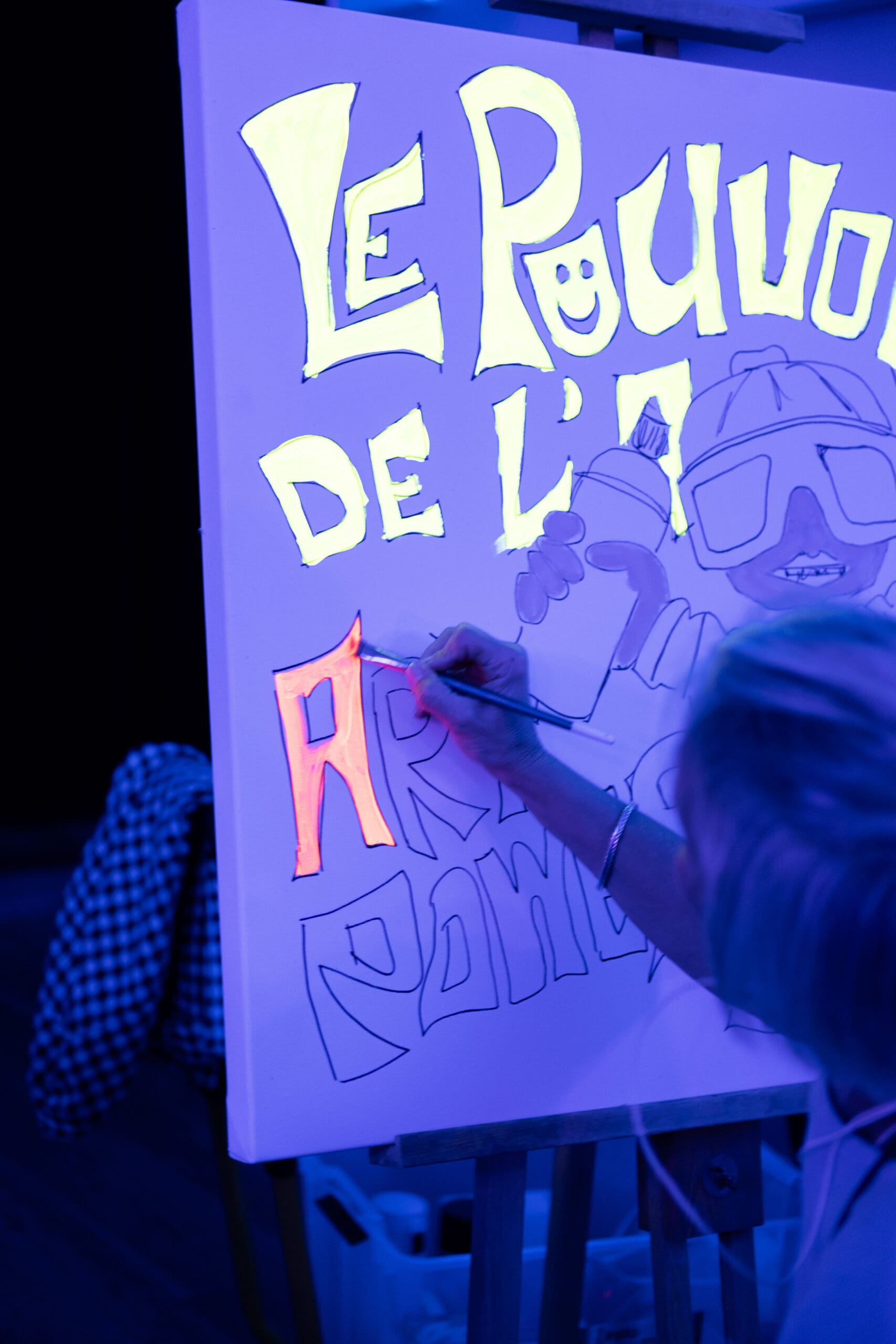 Une cinquième artiste, Stéphanie Laurin, avait quant à elle le mandat de diriger et d’animer la création d’une œuvre collective. Les participantes et participants ont ainsi été invités à expérimenter la peinture UV et à laisser libre cours à leur imagination pour contribuer à cette création commune.