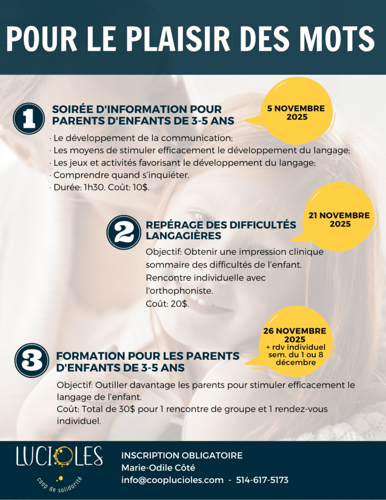 Les inscriptions aux ateliers Pour le plaisir des mots sont maintenant ouvertes ! Destinés aux parents d’enfants de 3 à 5 ans, ces ateliers offrent des outils concrets pour stimuler le langage et prévenir les difficultés dès le plus jeune âge. Animés par une orthophoniste, ces ateliers combinent activités ludiques, repérage des besoins spécifiques et conseils personnalisés.