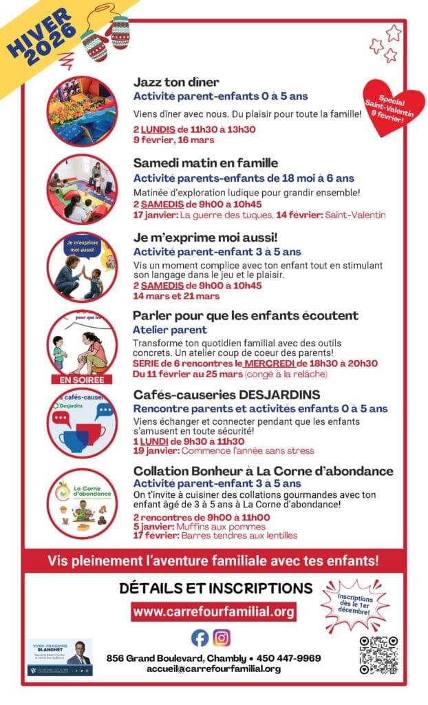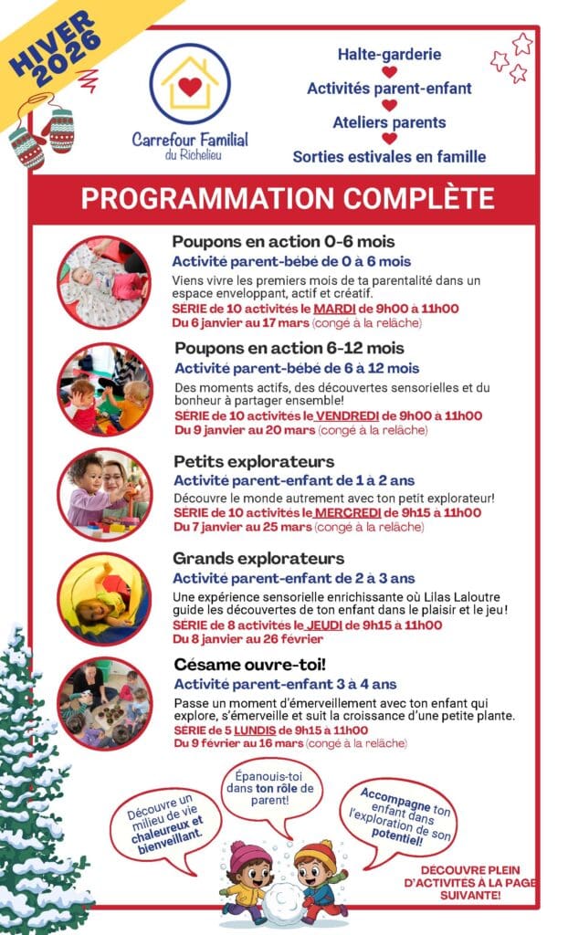 Le Carrefour Familial du Richelieu dévoile sa programmation d’hiver, dont les activités débuteront officiellement le 6 janvier prochain. Fidèle à sa mission, l’organisme propose une variété d’initiatives visant à accompagner et soutenir les familles de la communauté tout au long de la saison hivernale.