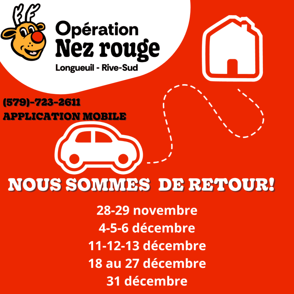 Présente partout sur la Rive-Sud, l’équipe d’Opération Nez rouge Longueuil Rive-Sud sera en service à plusieurs reprises au cours des prochaines semaines. Que vous soyez de retour d’un souper entre amis, d’un party de bureau ou d’une activité festive, ce service bénévole demeure l’une des façons les plus sûres de conclure la soirée.