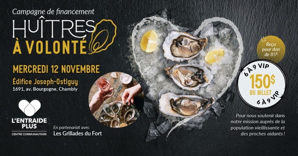 Le Centre communautaire l’Entraide Plus tiendra un souper-bénéfice VIP « Huîtres à volonté » le mardi 12 novembre, de 18 h à 21 h, à l’Édifice Joseph-Ostiguy de Chambly (1691, avenue Bourgogne). Cette activité gourmande permettra d’amasser des fonds essentiels pour soutenir la mission de l’organisme, qui offre des repas à prix abordables et des activités variées destinées aux personnes aînées et aux proches aidants de la région.